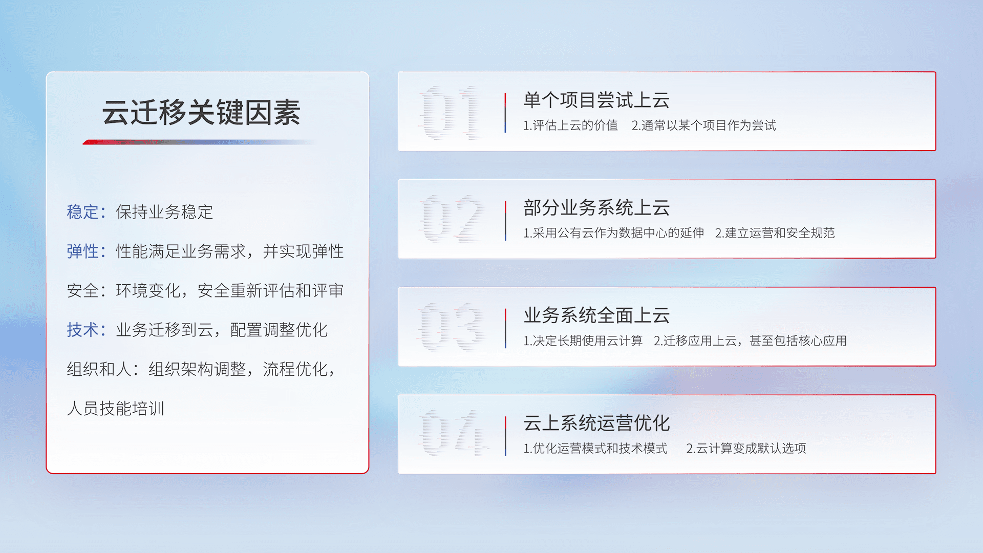结合实际业务,,,,从规划设计、、、云平台选型、、云原生改造、、数据迁移、、集成交付,,,迁移全过程为客户识别最佳上云路径,,,,做好风险识别管理,,设计网络架构、、、、身份权限、、安全审计合规、、操作审计、、、日志审计、、监控告警策略、、、多站点容灾设计等,,,对云上基础设施进行整体规划,,,提升IT治理水平,,以满足弹性、、、、高可用、、、高性能的需求。。。。
