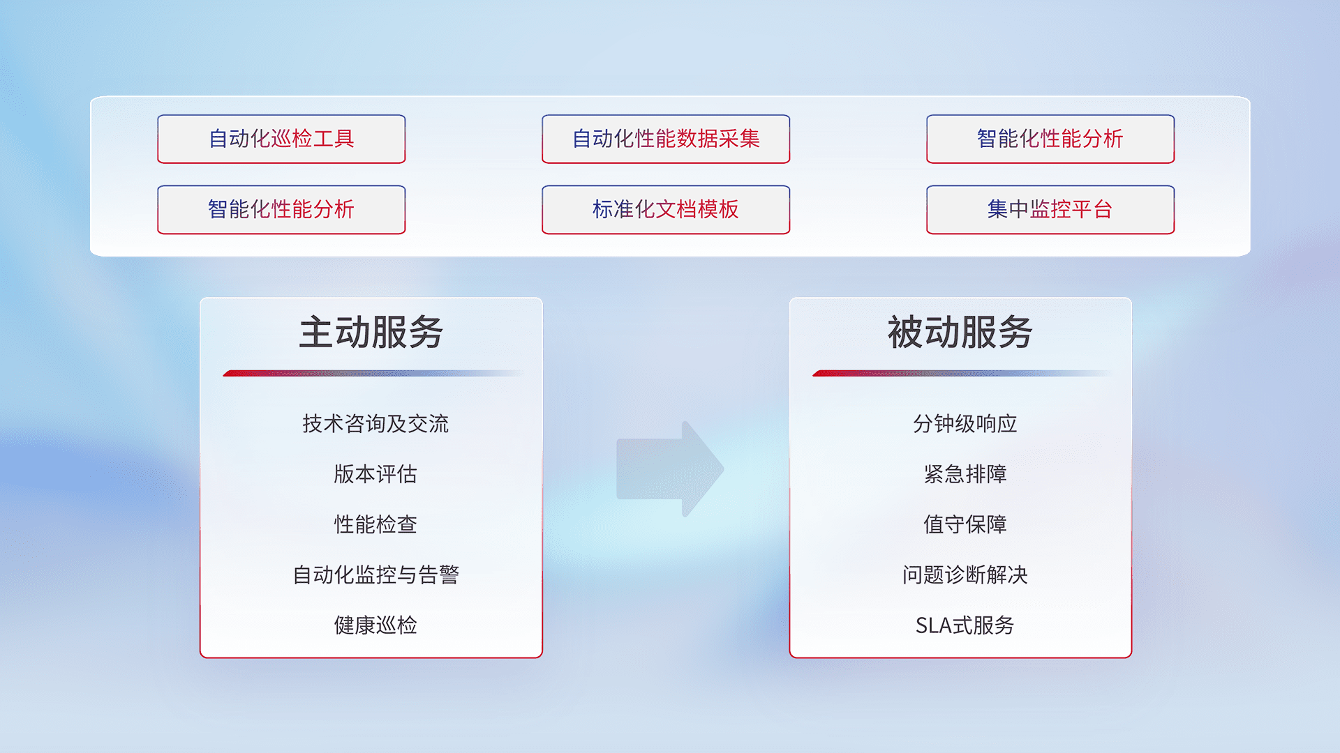 智能化工具和标准化文档,,,保障服务质量,,,提供主动服务(包含技术咨询、、、、版本评估、、性能检查、、、自动化监控与告警、、、、健康巡检)和被动服务包含(分钟级响应、、、紧急排障、、值守保障、、、、问题诊断解决、、SLA服务)。。。。